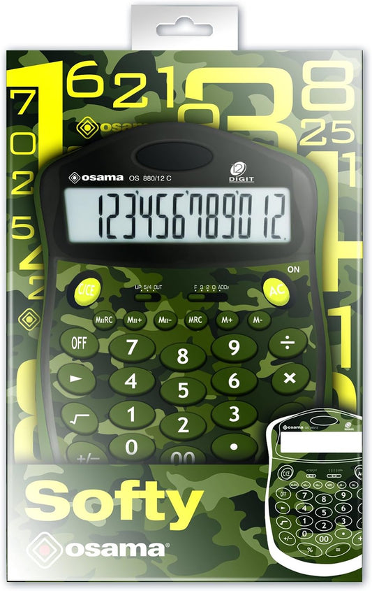 OSAMA Softy - Calcolatrice da Tavolo per Ufficio e Scuola a 12 Cifre e 6 Tasti di Memoria, Prodotto di Cartoleria e Cancelleria con Schermo LCD a Energia Solare e Profilo Gommato Antiurto 20x13.5x2 cm